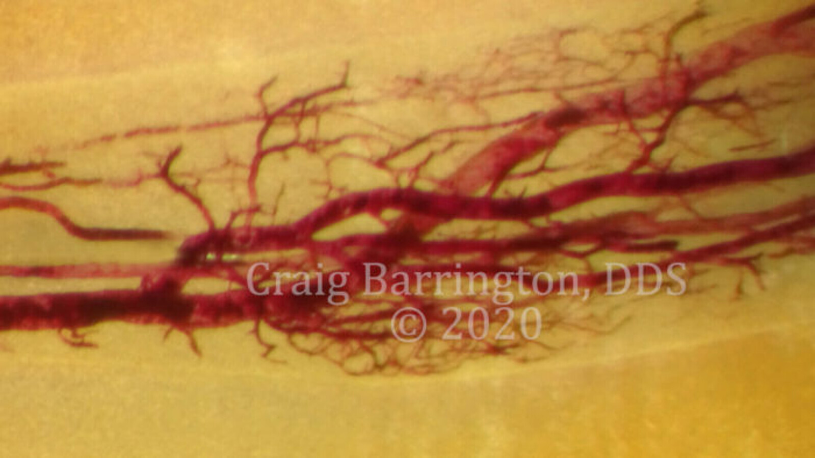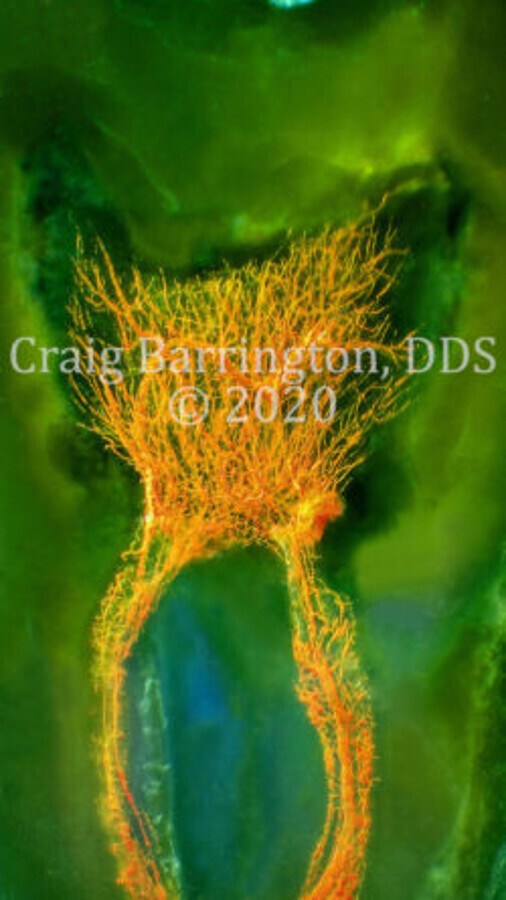 Since that article appeared, Barrington has refined and improved his technique even further, with results that are often even more breathtaking in scope and sheer beauty. Barrington’s photographs of the interior of teeth often reveal vasculature that is more complex than has previously been revealed. Some of the images resemble other forms in nature, such as the branches of a tree, or a river and its tributaries, or even a coral formation.