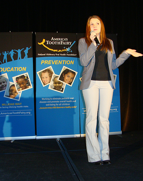 America's ToothFairy ambassor and rising star Savannah Robinson tells her story before singing ‘Beautiful’ at the NCOHF’s ‘Celebration of Smiles’ gala Thursday evening. (Photo: Fred Michmershuizen, Dental Tribune)