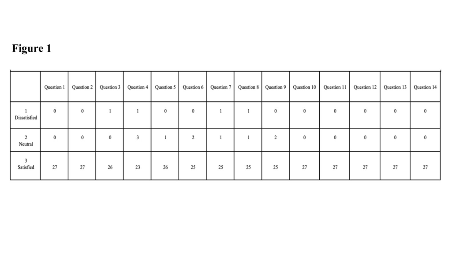 The survey questionnaire offered respondents the opportunity to rate questions on a 1 through 5 scale. In the data analysis phase, responses were grouped into three categories—satisfied (#4 & #5); neutral (#3); and dissatisfied (#1 & #2) to order, analyze and interpret data from the 27 respondents.
