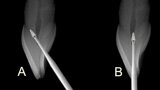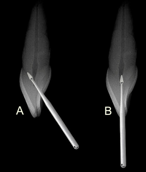 Fig. 6: A potential problem when attempting to access the orifice in anterior teeth is an approach at the middle of the lingual surface with an angle not following the root’s long axis that can lead to perforation of the tooth on the facial cervical (A), and the bur being used for access should be kept parallel to the roots long axis which often places the orifice under the incisal edge (B).