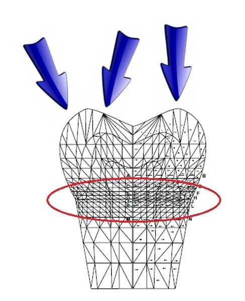 Fig. 1: Finite element analysis when the tooth is loaded under function by either longitudinal or off-axis forces leads to concentration of those forces in the cervical region of the tooth. Image courtesy of Dr. Gene McCoy. (Photo provided by Dr. Gregori M. Kurtzman)