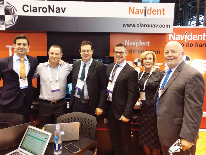 From left: Christian Pusateri, Dr. Ido Bermanis, Dr. Luigi Stefanelli, Jason Fardo, Beth Budreau and Darrel Cook at the ClaroNav booth, where you can learn all about the Navident 2, which provides surgeons an easy-to-use, accurate and portable means of planning restorations and implant placements.