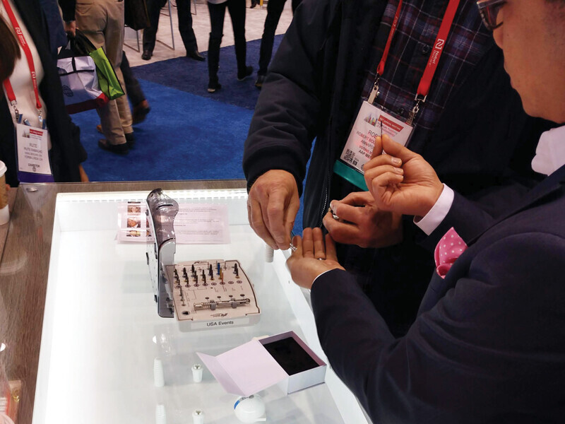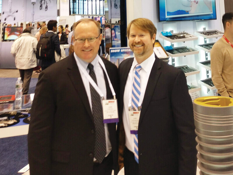 Chris Hall, left, and Chad Blaylock can talk to you about the new OCTAGON Bone Level Tapered implant, part of the infinity dental implant systems, at the ACE Surgical Solutions booth.