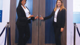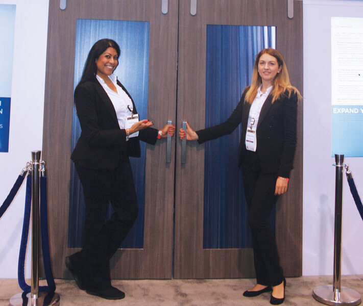 Zohra Hasta and Oksana Zimina of Henry Schein One prepare to open the doors to attendees at the company’s grand presentation.