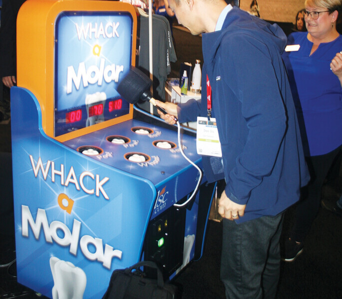 CDA attendee Stan Siu gives the ‘Whack a Molar’ game a try to win some prizes at the CDA Member Benefits booth.