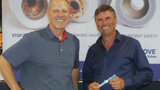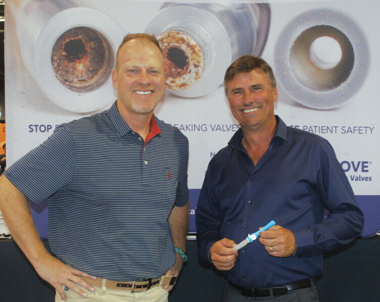 Jim Langeloh and Brian Peters of Stoma Dental stand ready to show off the company’s Dove Disposable Valves.