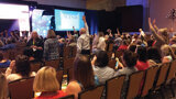 Attendees show off their excitement during Thursday morning’s opening session, featuring body language expert Traci Brown.