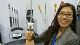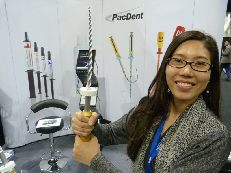 Sara Qu wields a giant rotary file in the PacDent booth.