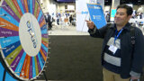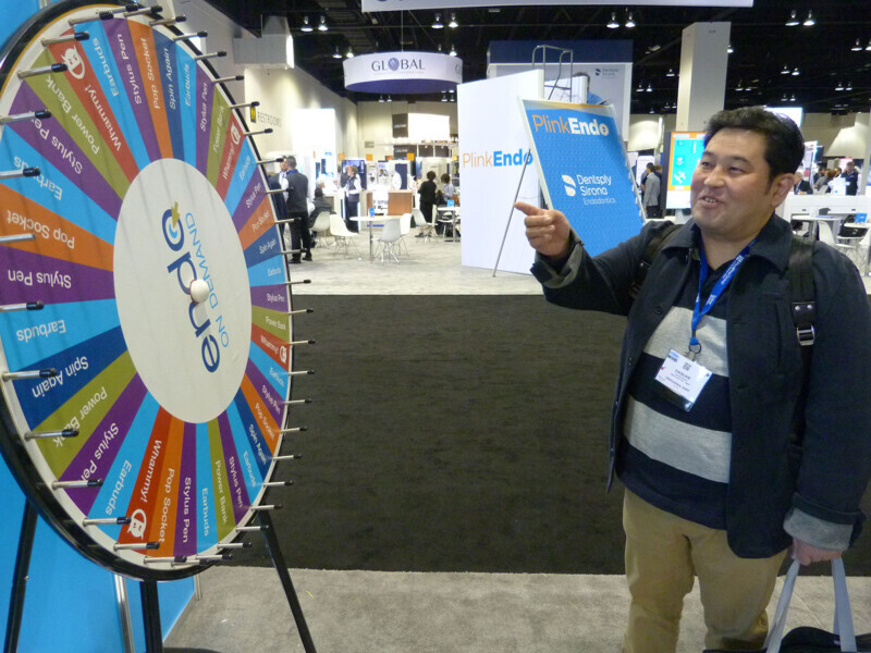 In the AAE Attendee Lounge, Daisuke Nagao, DDS, of Hitachinaka City, Japan, waits for the prize wheel to stop spinning (his prize: a pair of earbuds).