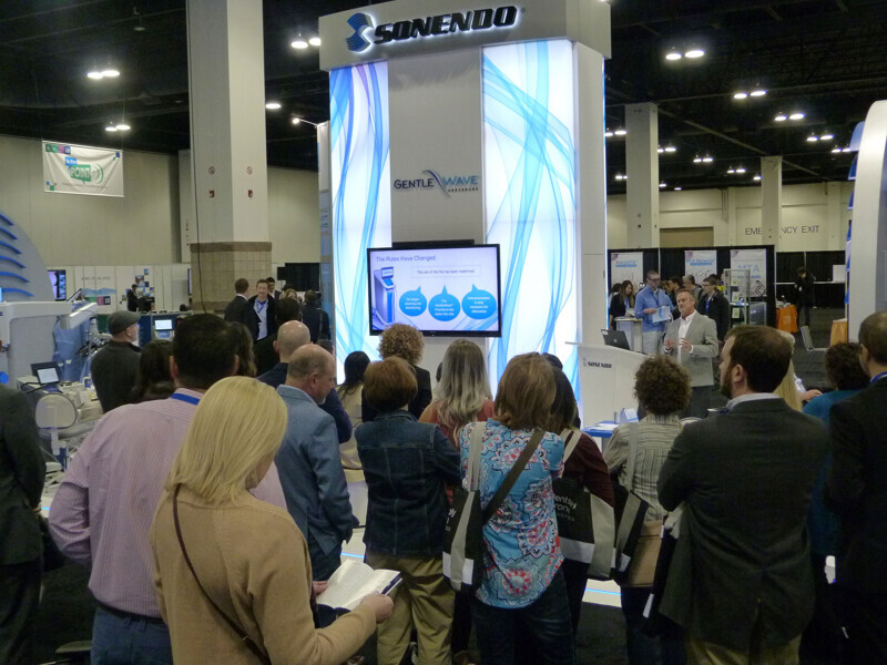 A standing-room-only crowd listens to the GentleWave presentation by Randy Garland, DDS, of Encinitas, Calif., in the Sonendo booth.