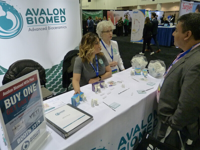 In the Avalon Biomed booth, Hugo Munoz, DDS, of Guatemala City, Guatemala, learns more about NeoMTA Plus after having worked with a sample. Helping him, from left, is Nikki Ruck and Carolyn Primus, PhD.