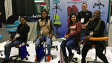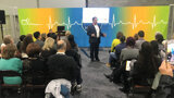 John Bonvini helps a group of attendees test out some of the latest ergonomic seating options available from RGP.