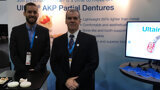 Displaying the innovative Ultaire AKP metal-free removable partial dentures in the Solvay Dental 360 booth are, from left, Matthew Sims and Duane Fish.