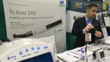 Kevin Boyle displays the BioSonic UC150 ultrasonic cleaning system in the Coltene booth.